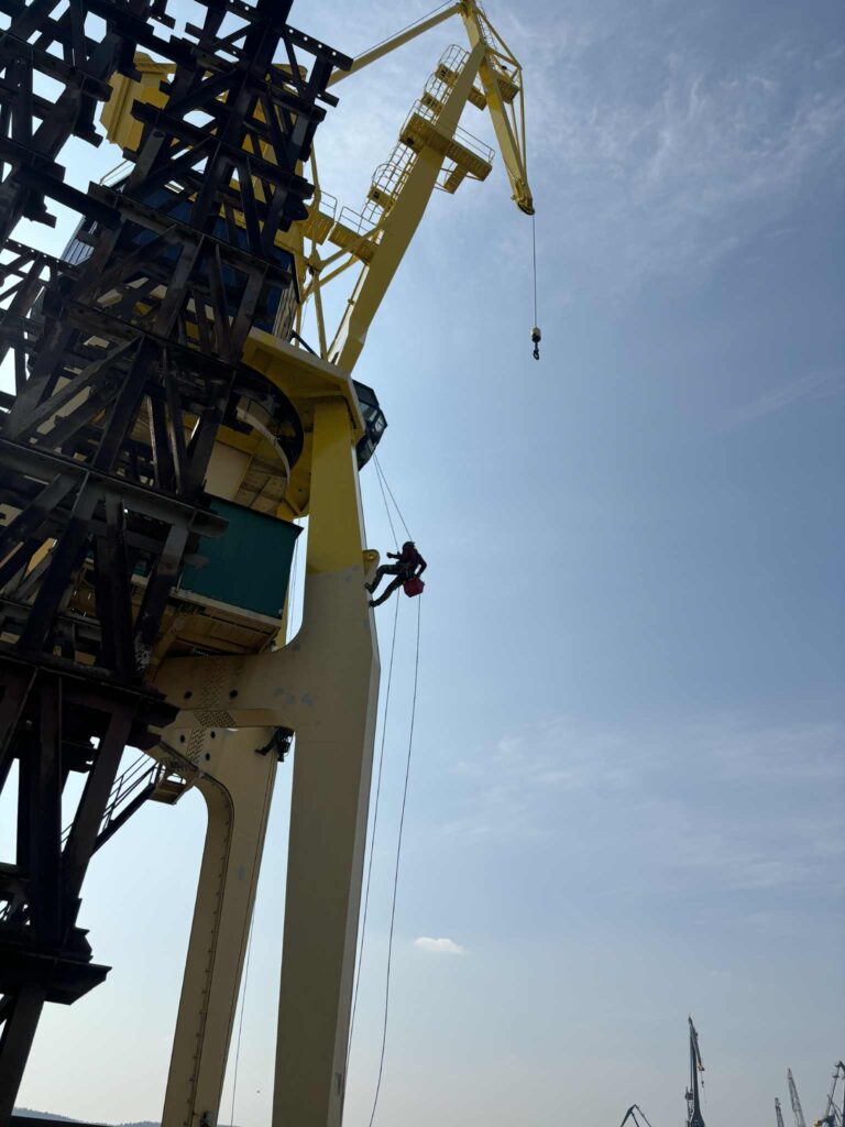 Ze względu na charakter obiektu wszystkie prace były prowadzone z wykorzystaniem technik alpinistycznych, co pozwoliło na bezpieczne i precyzyjne dotarcie do trudno dostępnych miejsc. Efektem jest odnowiona i zabezpieczona konstrukcja dźwigu, gotowa do dalszej eksploatacji w wymagających warunkach portowych.